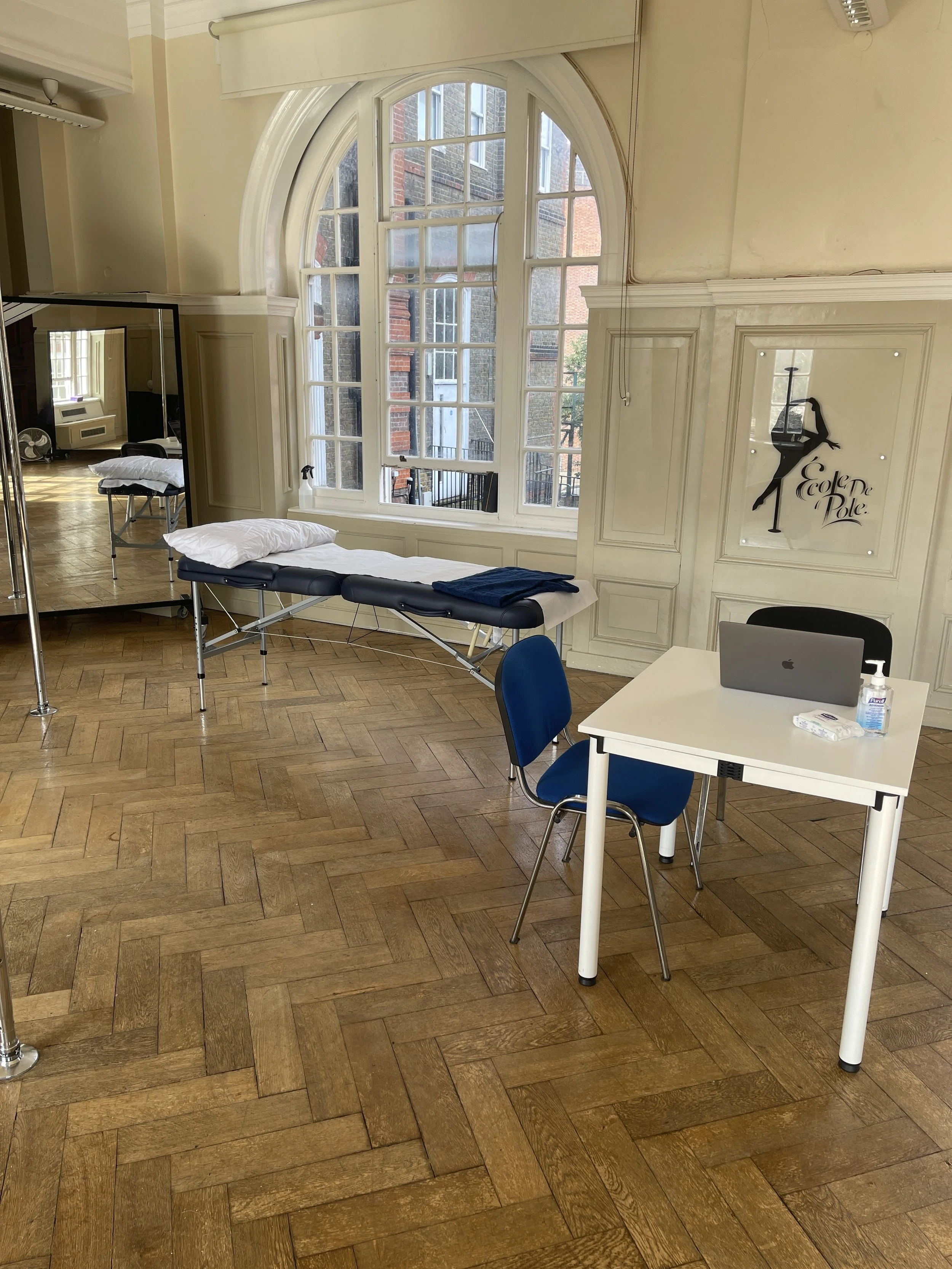 Based in studio 2, the space has been fully kitted out with everything required to offer high quality physiotherapy in a relaxing environment. With both poles and aerial equipment available, you activity can be incorporated directly into your assessment and treatment (no more trying to explain to your healthcare provider what it actually means when you say your shoulder hurts in a split grip!).