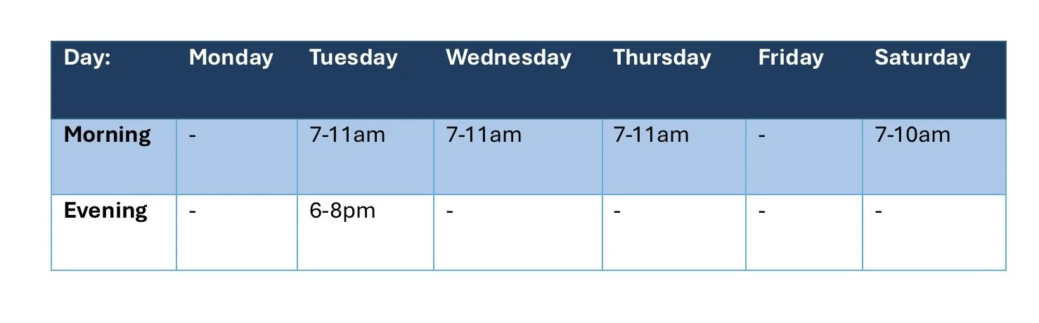 Please see below the currently available time slots for physiotherapy and other services.
